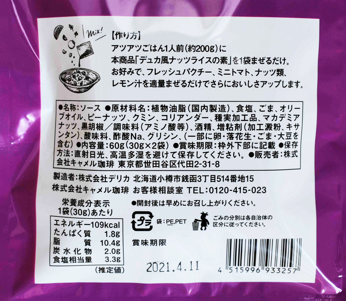 そこで発売されたのが、この調味料を使った「デュカ風ナッツライスの素」213円(税込)というわけです。