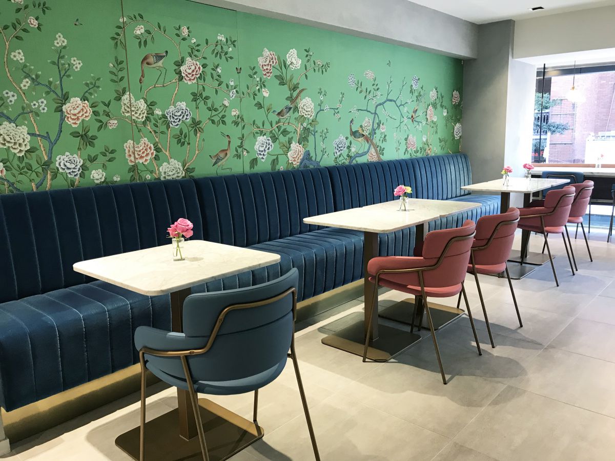 まず店内に入ると、異国を感じる豪華な内装にうっとり。華やかなエメラルドグリーンの壁紙や大理石のテーブル、椅子は、本場ドバイのショップと同じインテリアを取り寄せたそう!