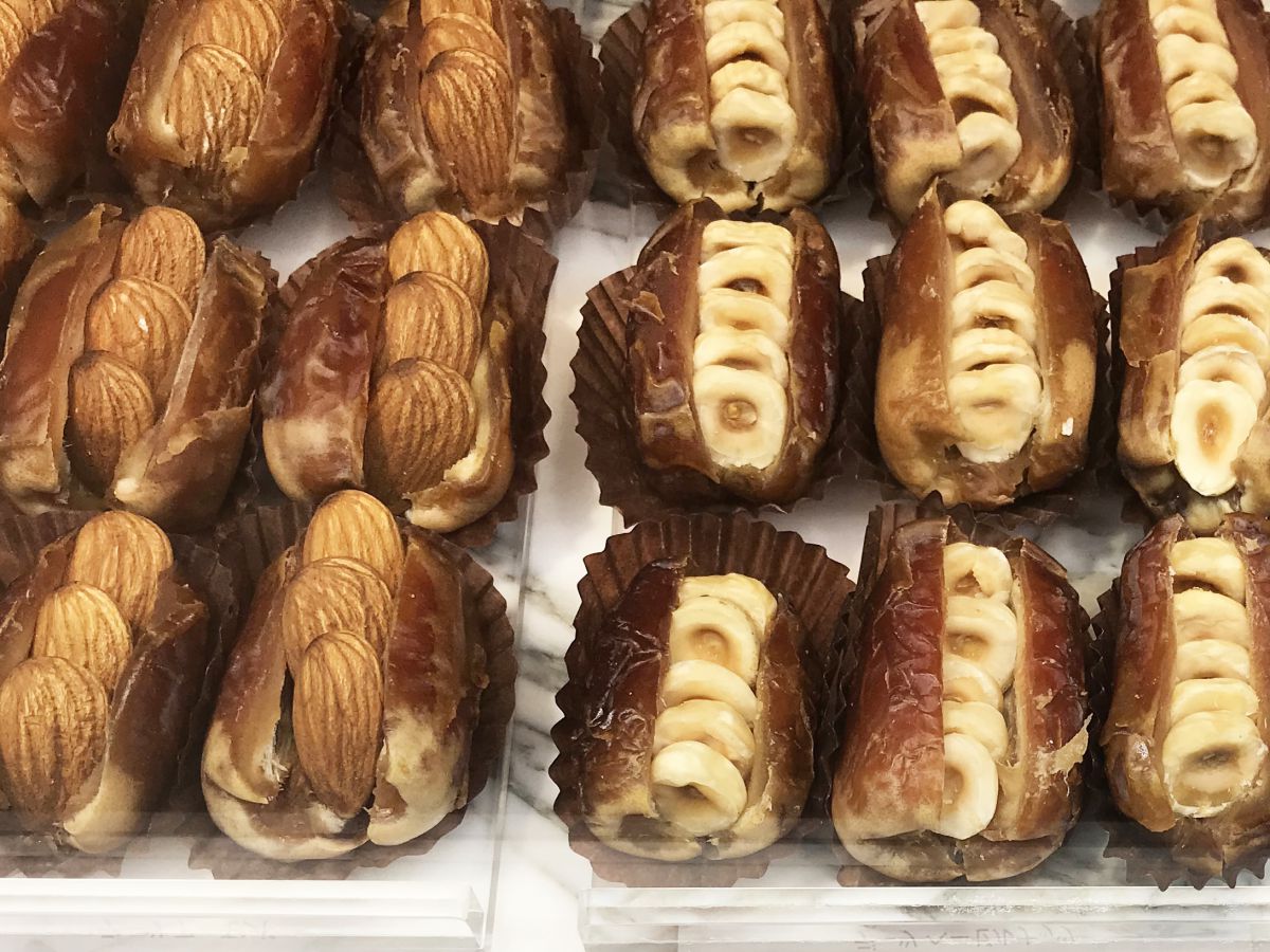 お皿中央にある、少し大きめのお菓子が「デーツ」です。外側はしっかり中はとっても柔らか。デーツそのものの甘み感じつつ、中に挟んだナッツやフルーツを楽しむことができます。デーツは、ミネラルやビタミンC、食物繊維がとても豊富なので、中東では日常的に食するドライフルーツだそう!