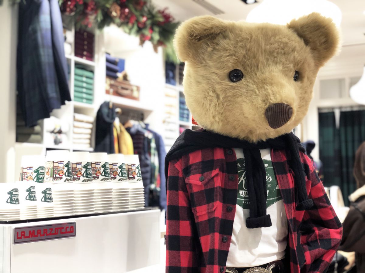 店頭には、「ラルフ ローレン」のアイコンとして親しまれている“ポロ ベア”のトルソーが!シーズンにより、さまざまなスタイリングでお出迎えしてくれますよ。