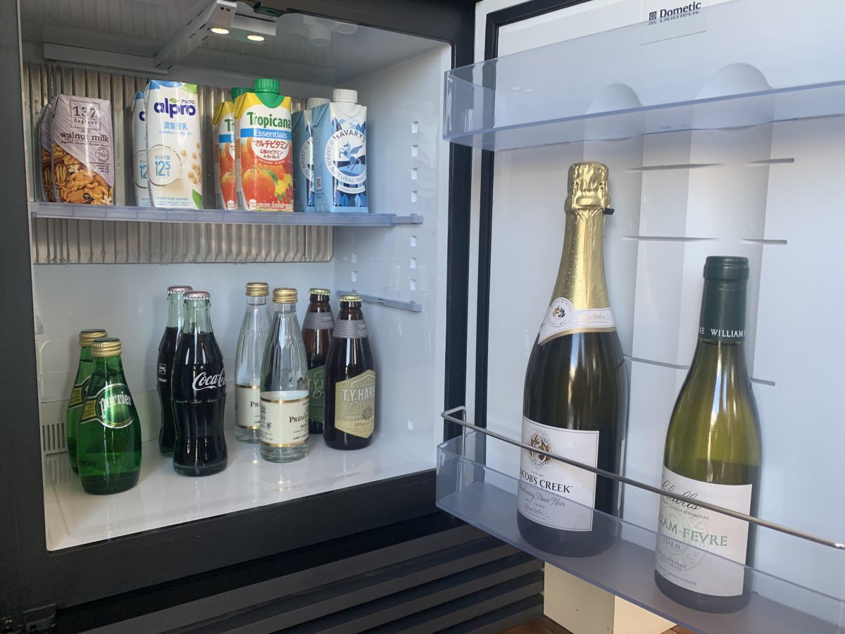 冷蔵庫に入っているドリンクは、ビンと紙パックのパッケージのものだけを置き、環境への負荷に配慮しています。