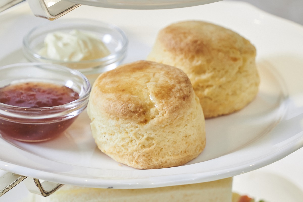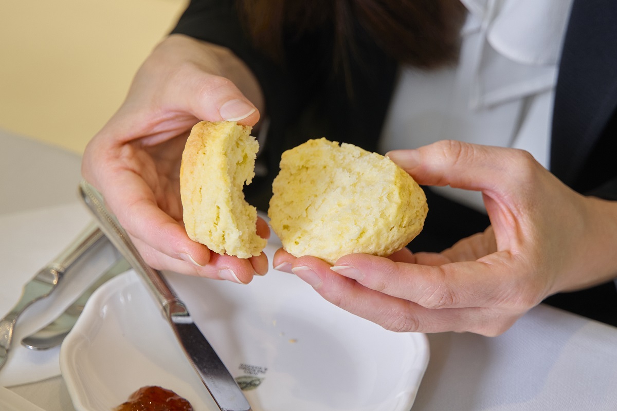 「スコーンは食べるごとに手でひと口サイズにちぎって、クロテッドクリームやジャムを付けていただきます。誰かとシェアする場合は、あらかじめ自分のお皿にクロテッドクリームやジャムを取りましょう」。スコーンは“運命の石”と呼ばれる食べ物なので、なるべくナイフは入れないほうがいいのだそう。