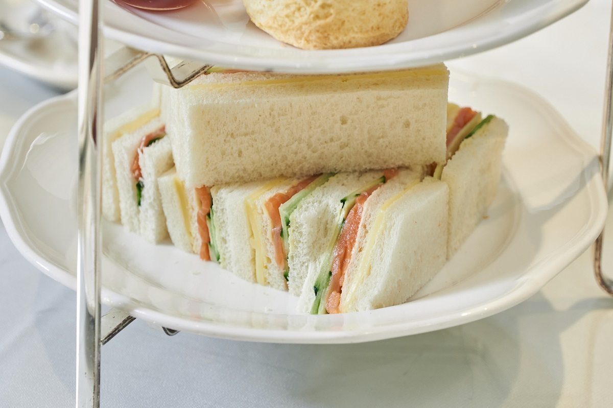 三段スタンドは、下段にキュウリとサーモンのフィンガーサンド、中段にはスコーン、上段にはケーキなどのスイーツが!