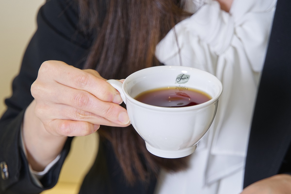 ハイテーブルの時はカップのみ、ローテーブルの時はカップとソーサーを持ち上げます。写真のように、取っ手に指はひっかけずにつまむのが正式なカップの持ち方。でもちょっとアンバランスなことも……。「指が通るサイズの取っ手でしたら、指を通してもいいんです。ただ、小指は立てないように気を付けてくださいね」。