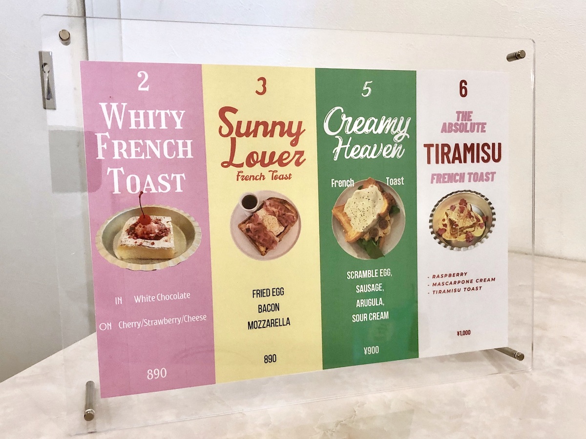 フレンチトーストは他にも、メープルシロップの甘さとべーコンのしょっぱさがクセになる「サニーラバー」(890円)、サワークリームをのせたお食事系の「クリーミーヘブン」(900円)、ほろ苦い「ティラミス」(1000円)と、どれも他では味わえない目新しいフレンチトーストばかり。