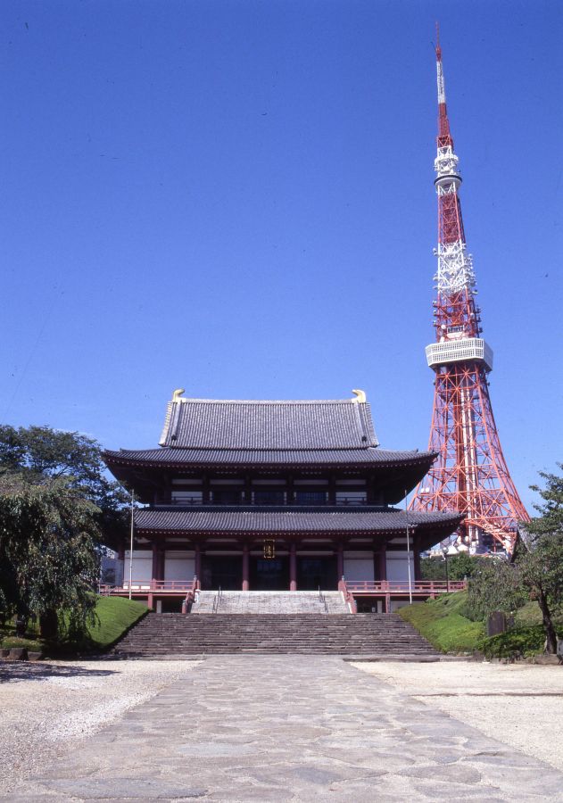 港区芝公園の中央部にあり、浄土宗七大本山の一つで、徳川家の菩提寺として知られています。明徳4年(1393)に創建され、徳川家康公ゆかりの秘仏「勝運・黒本尊」を祀り、二代将軍秀忠公をはじめ6人の将軍が埋葬されています。大殿地下1階の宝物展示室には、英国ロイヤルコレクション所蔵で、二代将軍御霊屋(本殿・拝殿)を10分の1で再現した「台徳院殿霊廟模型」などを展示しています。