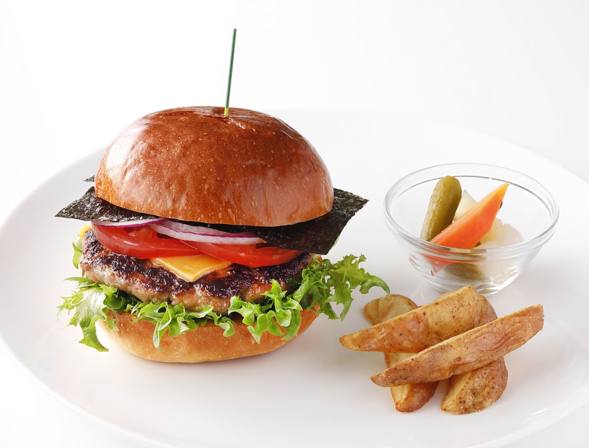 香ばしく焼き上げたブリオッシュ生地のバンズに挟まれるのは、1カ月じっくりと寝かせた旨味の凝縮したソースを絡めた大豆ミート。アクセントに海苔を加えたニューバーガーは、満足感もしっかりと感じられ男女問わず人気の逸品です。