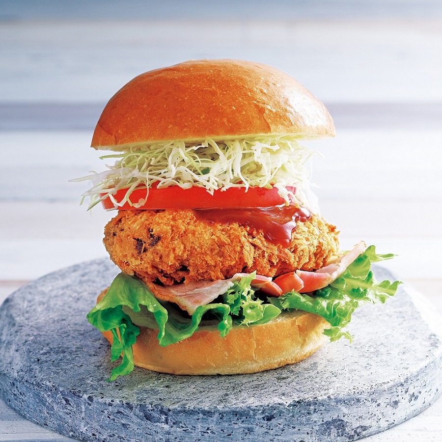 会場限定、上野『肉の大山』の「東京ビーフメンチカツバーガー」(1個)801円。希少な黒毛和牛「東京ビーフ」の脂の甘みを楽しむ、肉卸店自慢の一品です。