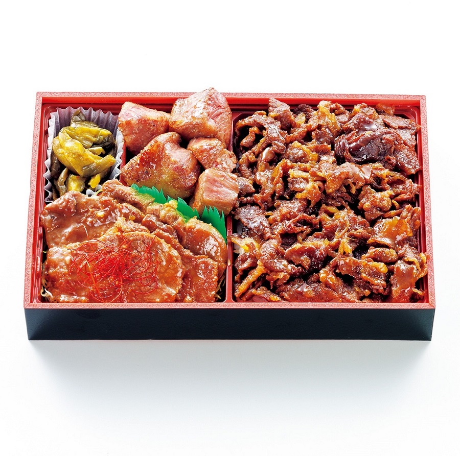 宮城『肉のいとう』の「A5ランク仙台牛横綱弁当」(1折)3240円は、仙台牛のサイコロステーキ、霜降りカルビ焼肉、すき焼き煮の贅沢3種盛り。
