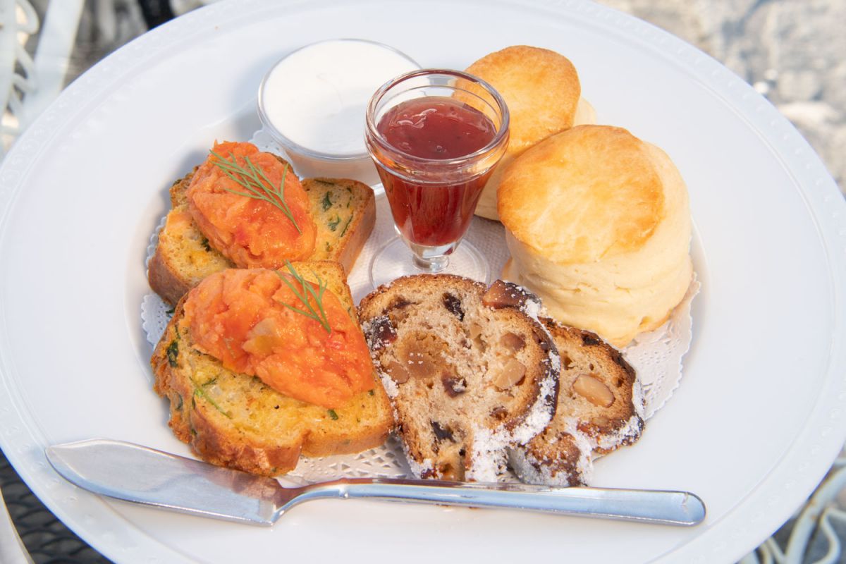 中段にはマスカルポーネとあまおうのいちごジャムを添えたイングリッシュスコーン、サーモンとトマトのケークサレ、シュトーレン。