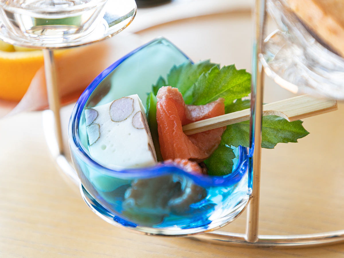 スイーツだけでなく、京料理をベースとしたミニ前菜のセイボリーも。写真は、サーモンお刺身(季節によって内容が変わります)に、たこの柔らか煮とむかごのしんじょうが添えられているもの。