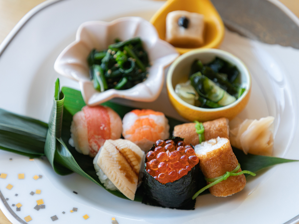 また、スタンドに乗ったメニュー以外にも、3種類の先付けと手毬寿司が別皿でついてきて、とても豪華!