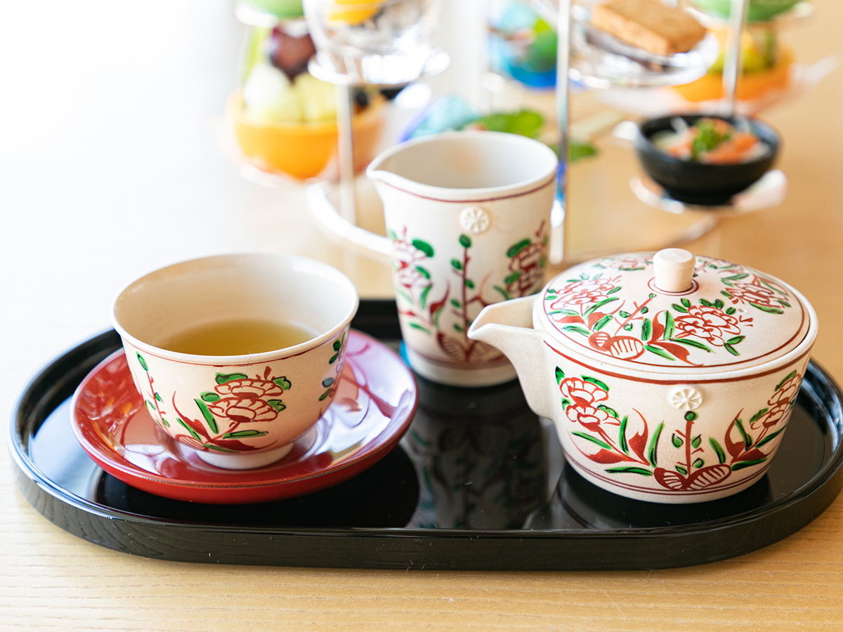 フリーフローでいただけるドリンクには、京都「祇園辻利」のお茶もあります。こちらは「たん熊北店」オリジナルの、手書きの花がかわいらしい茶器で提供されます。