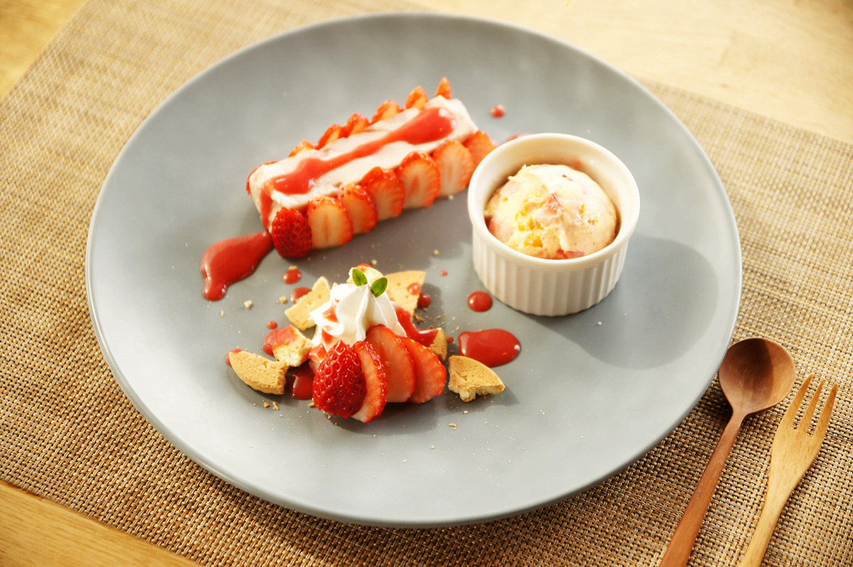 デザートには大子町産のいちごを使った冬~春限定の「いちごプレート」700円を。とちおとめ、いばらキッス、ひたち姫などその時においしい品種を使った、いちごアイスやムース、ピューレなどで大子町産いちごの魅力を堪能できる一皿です。