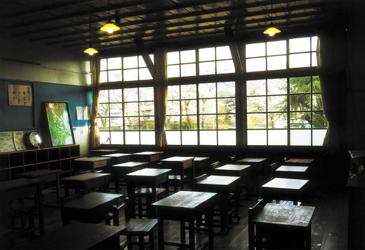 週末や祝日には校舎内も自由に見学ができます。木製サッシの窓ガラスや、落書きが残る小さな机や木のイス、ランプ型の照明まですべてがレトロ!なんだか明治時代にタイムスリップしたかのような気持ちになります。