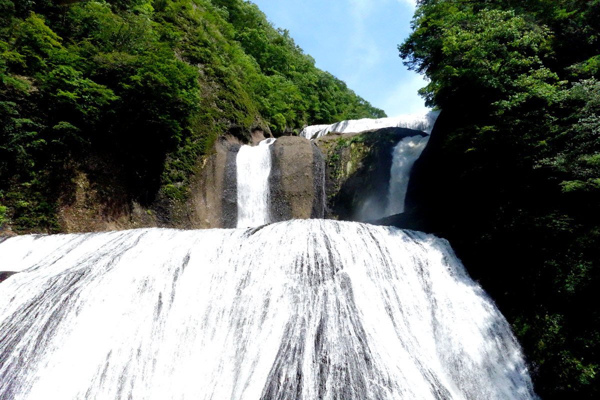岩肌を勢いよく水が流れ落ち、しぶきがかかるほどの迫力にびっくり! さすが日本三名瀑のひとつだけあります。若々しい緑と白い水の流れのコントラストの美しさにうっとり。