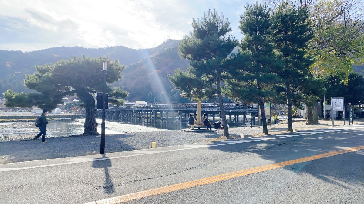 広く穏やかな一級河川・桂川の川辺から見える渡月橋と緑深い山々。この景観を見ると、嵐山に来たなぁという気分になります。渡月橋を左手に見ながら桂川に沿って西へ少し進む場所にある、とっておきの穴場カフェが「パンとエスプレッソと 福田美術館」です。
