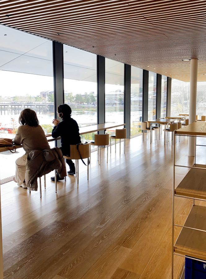 見学が終わったら、日本画の繊細な美しさの余韻に浸りつつ、カフェタイム。「パンとエスプレッソと 福田美術館」は、企画展が催されている2階の、桂川に面した場所に設けられています。