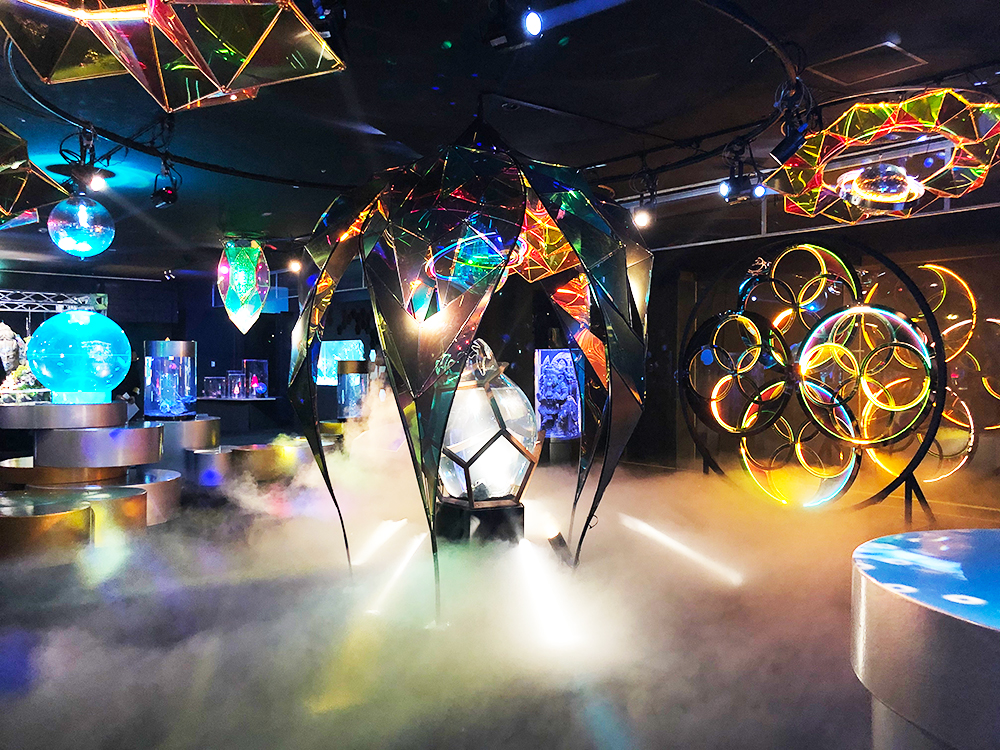ここでも、光と反射の空間作品を得意とするアート集団「MIRRORBOWLER(ミラーボーラー)」や革新的な家具が魅力の「SIXINCH(シックスインチ)」、さらには個性豊かな天然石のジュエリーデザイナー「SUKES(スケズ)」とコラボして、さらにきらびやかな異空間を実現。