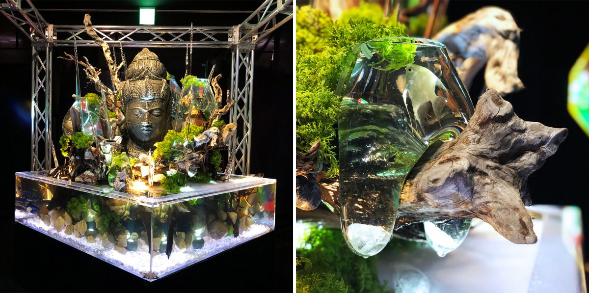 奥には、GA☆KYO MIYAZAWA氏渾身の流木アクアテラリウムも。仏像と流木を組み合わせ、千手観音をモチーフにした息をのむ作品です。