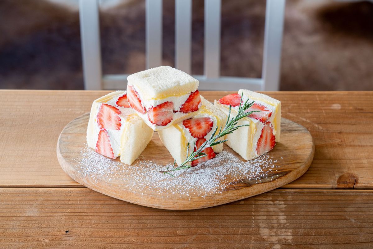 完熟いちごの甘さと食感を存分に楽しめるよう細部までこだわった「キュービックいちごサンド」。フワッと優しいオリジナルクリームとカスタードクリームでいちごをサンド。かぶりついた瞬間、じゅわっと口いっぱいに広がるいちごのジューシーさはまさに幸せの味わいです。