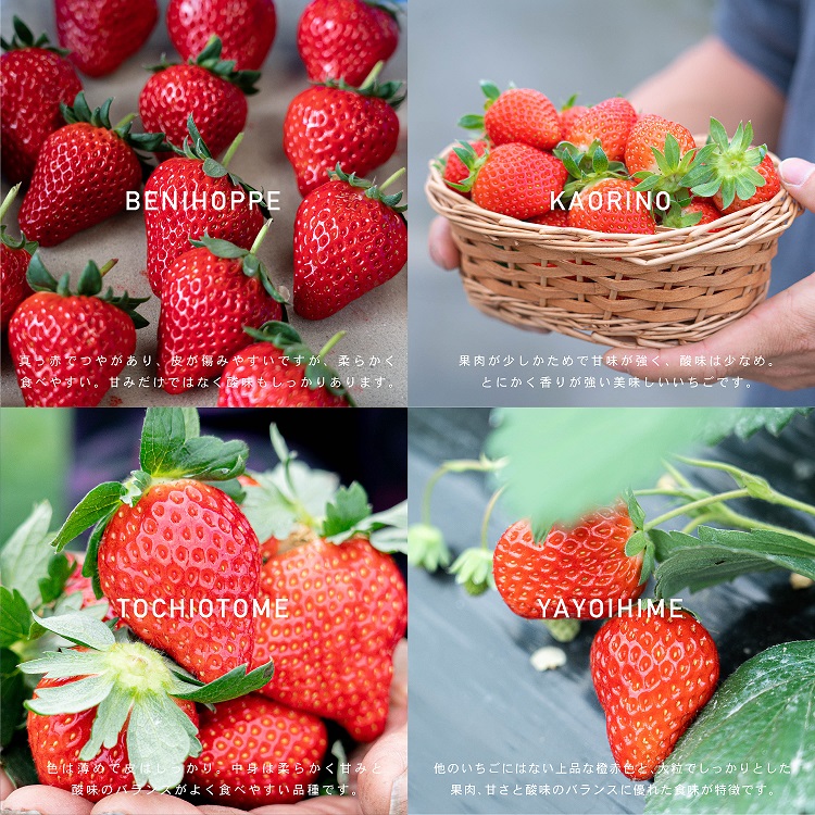 「紅ほっぺ」、「とちおとめ」、「かおり野」、「やよいひめ」の中から、いちごマイスターがおすすめ品種をチョイス。どの品種になるかは当日のお楽しみ。味・食感・香りの違いを食べ比べしてしると、好みのいちご品種に出会えるかも。