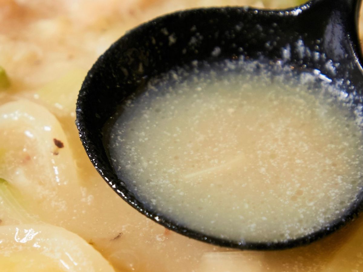 味のかなめは牛骨を約20時間かけて煮込んだベーススープです。牛骨から抽出したうまみ満載のこのスープとじゃがいもやネギを一緒に煮込むことで、さらにトロトロに。
