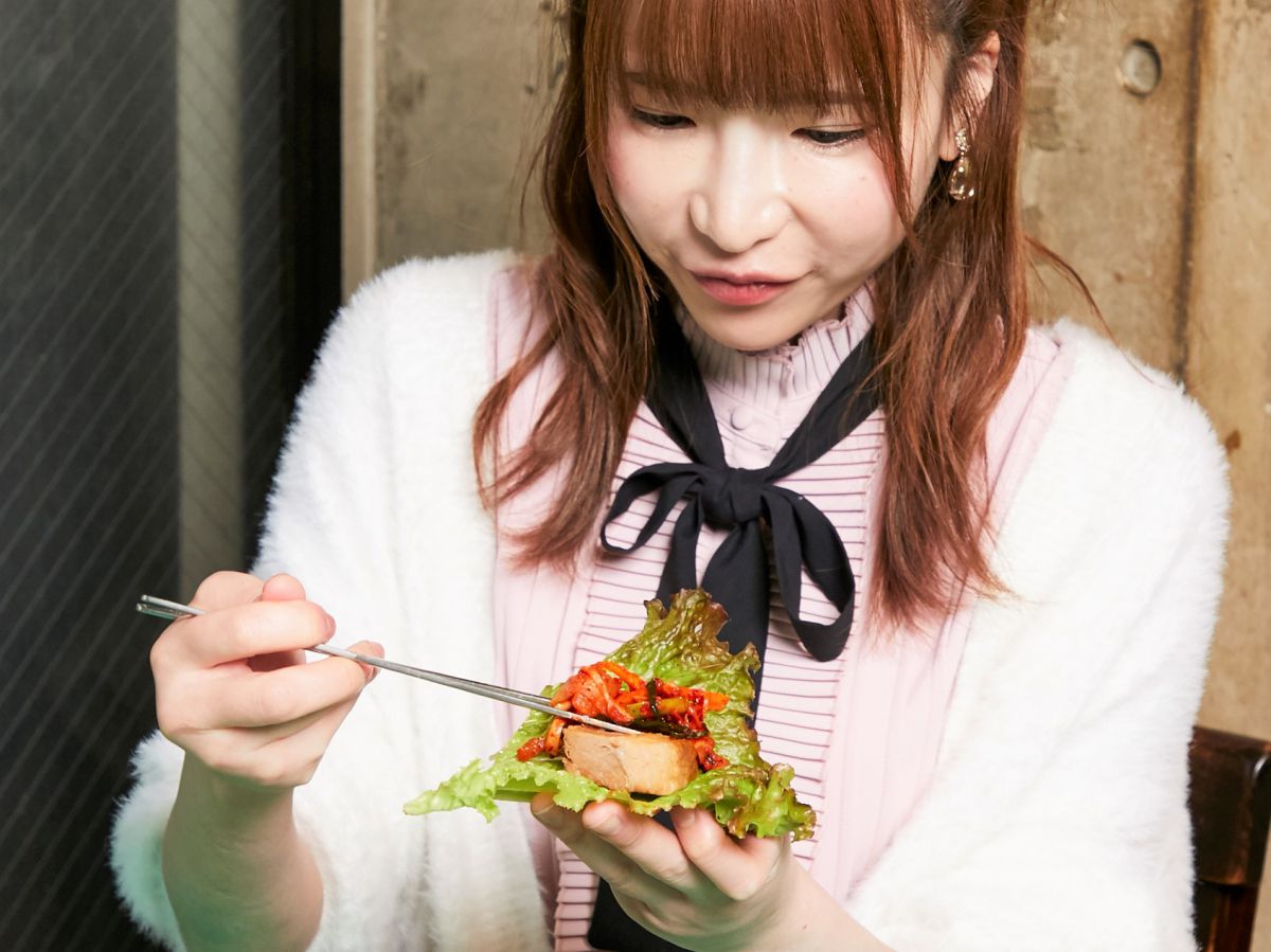 もえあずおすすめ2品目は「ポッサム」。オリジナルの味付けで長時間煮込んだとってもやわらかい豚肉と自家製キムチをサンチュ(レタス)に包んで食べるひと品です。常にオーダーランキング上位に入っている人気メニューのひとつですよ!