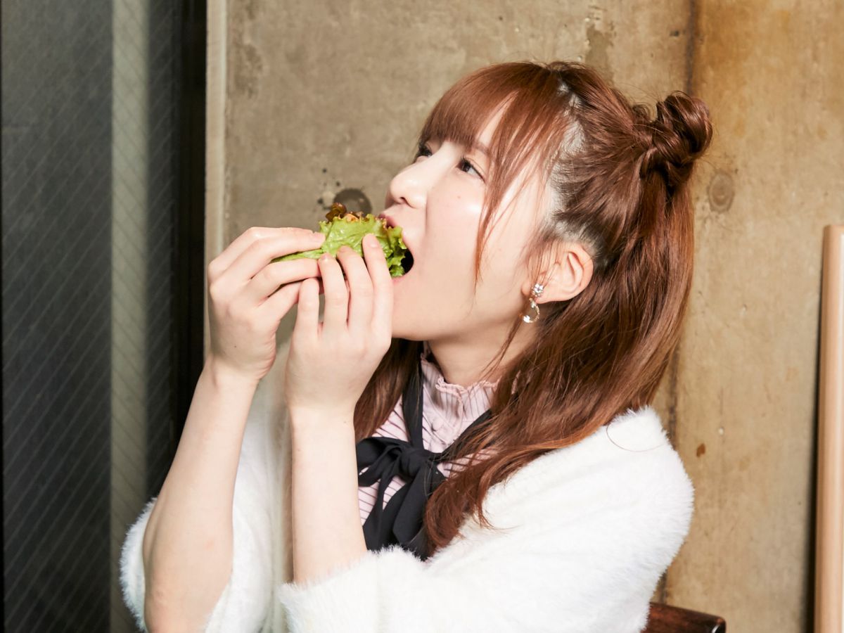 もえあず流ポイントは、豚肉を覆うように自家製キムチをたっぷりとのせること!この角煮自体が横幅約3cm×厚みは約2cmと、かなり極厚にカットされているので、具を包むのは至難の業。