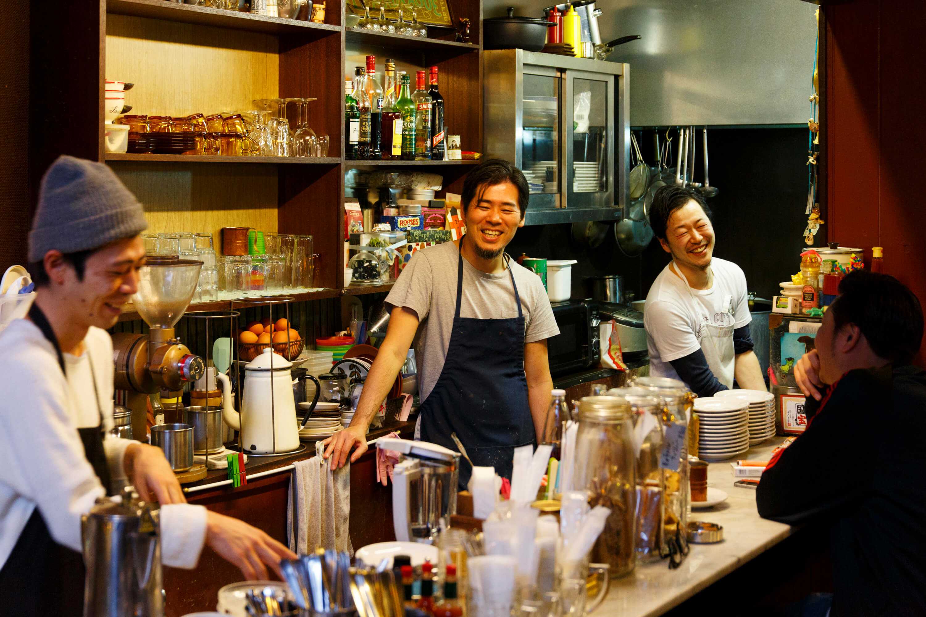 常連さんと談笑中のスタッフたち。「喫茶文化を次世代に伝えていく」という夢を共に叶えるために集結。マドラグを支える頼もしい仲間たちです。