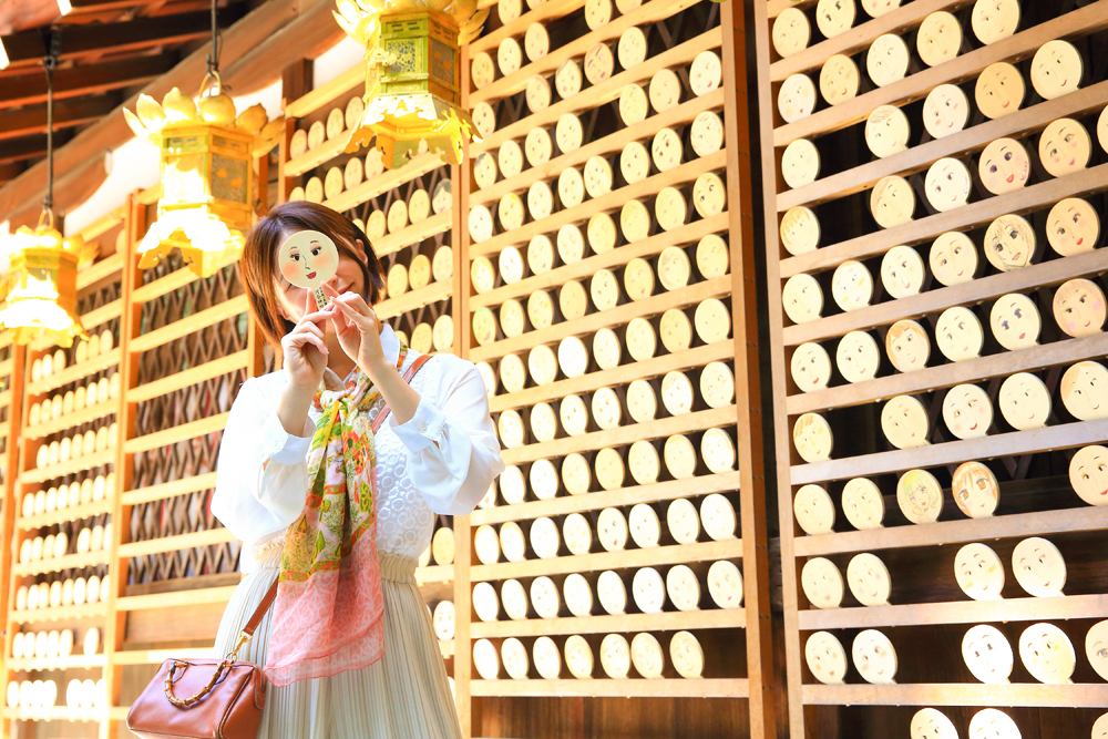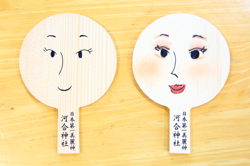 左がビフォアー、右がお化粧を施したアフターです。自身のメイク道具か備え付けの鉛筆を使って、手鏡の絵馬に自分の表情を自由に描き、「美」を祈願します。境内で奉納されたみんなの絵馬を見るのも楽しい!