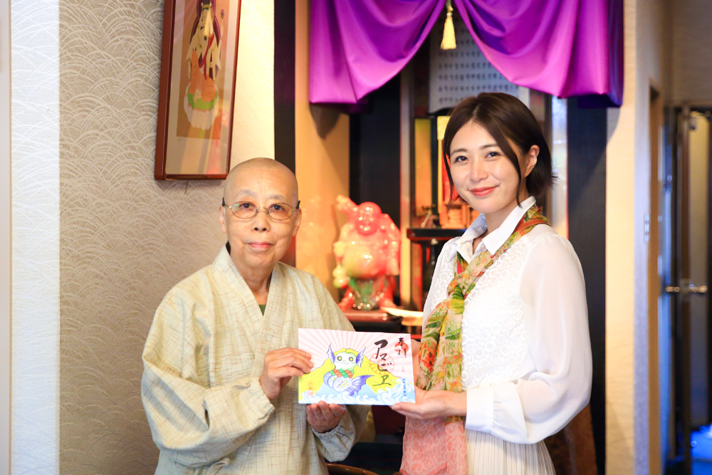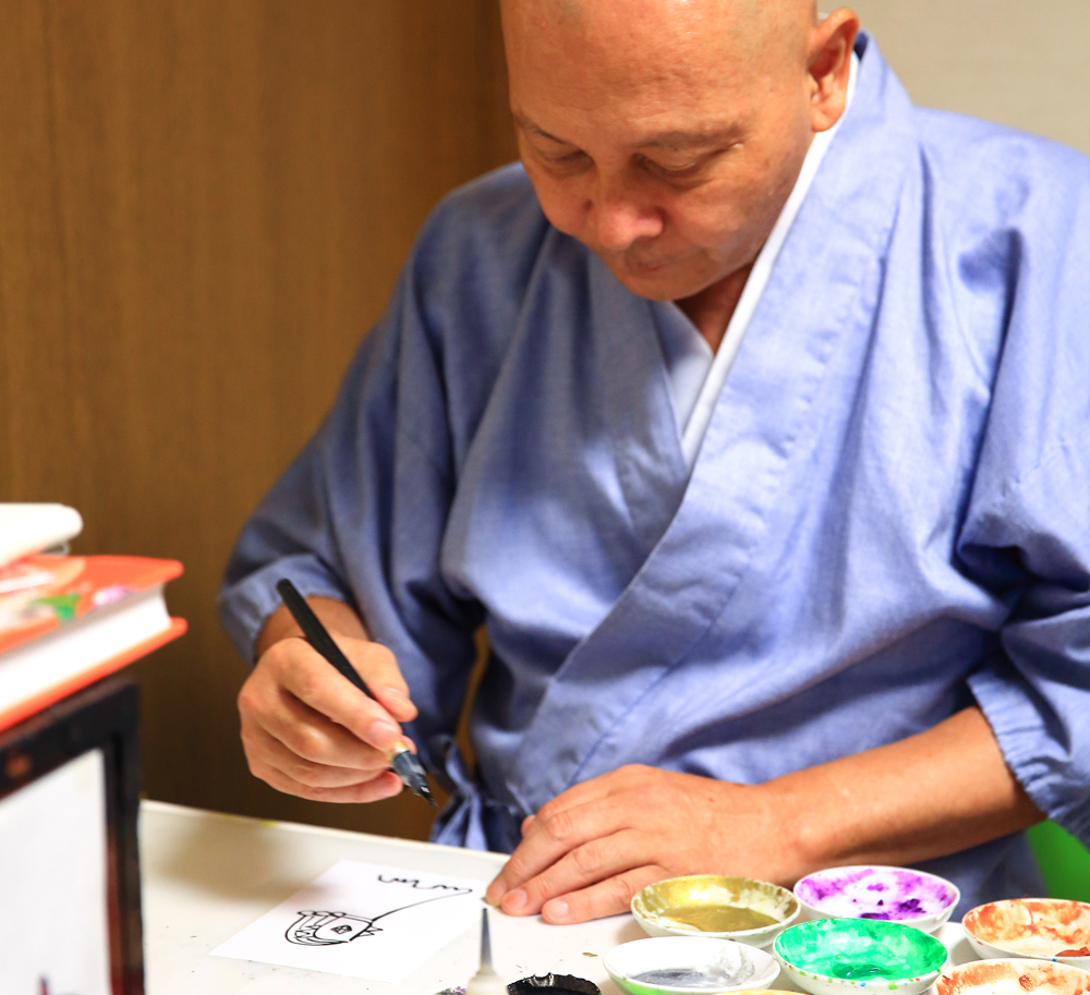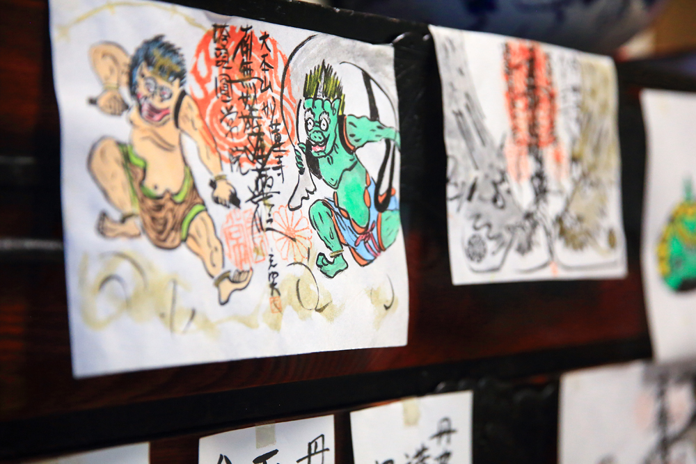 住職の佐野充照(じょうしょう)さん。2018年から参拝者の思い出になるように、と御朱印に絵が入るようになったそう。風神雷神や七福神など希望に応じて何でも、10~15分程度で描いていただけます。旅好きな住職との気さくな会話も楽しみの一つです。