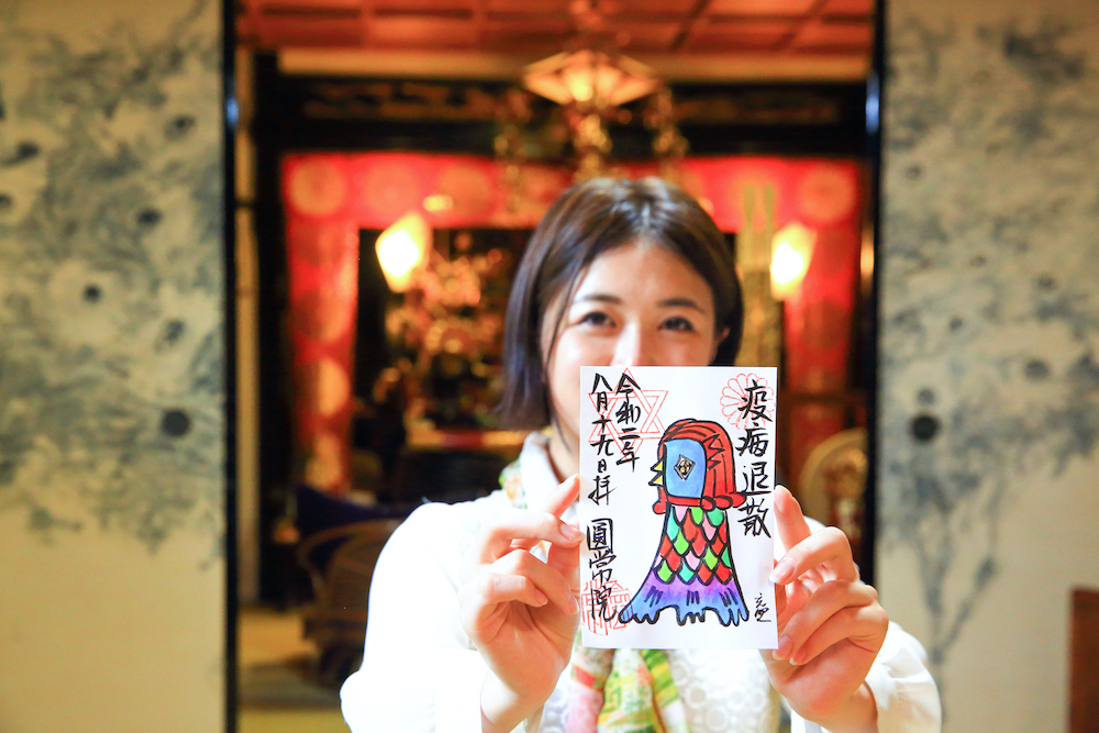 次はバス、またはタクシーを使って、少し離れた圓常院へ。妙蓮寺の敷地内に立つ塔頭で、ご本尊のほか、がん封じにご利益があるといわれる赤球石霊験(せっきゅうせきれいげん)大明神を祀っています。住職が描くイラスト入りの御朱印が有名で、今回は疫病退散を祈願してアマビエをお願いしました。ポップな色使いのアマビエは、眺めているだけで元気が湧いてきそう。