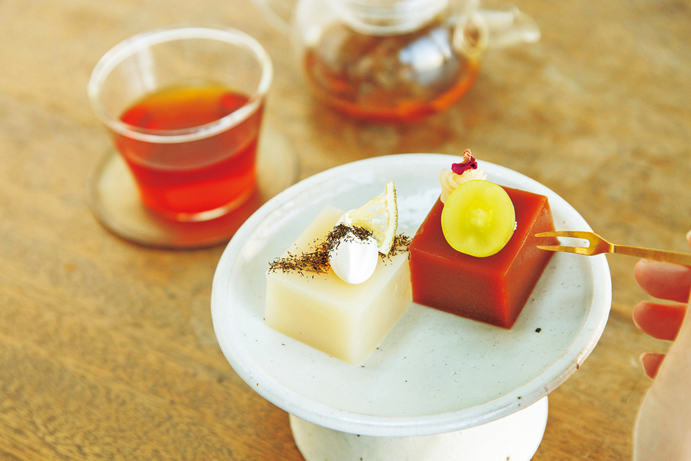 圓常院から徒歩10分、堀川鞍馬口辺りに来たら、うめぞの茶房は外せません。昭和初期に創業した甘味処・梅園の3代目が手掛け、かざり羹1個350円~が今や京都甘味の定番といっていいほど大人気。餡(あん)をわらび粉・寒天で流し固め、フルーツや生クリーム、ナッツなどをトッピングしたもので、レモンやフランボワーズなど、和洋折衷の斬新なビジュアルと味わいが魅力です。