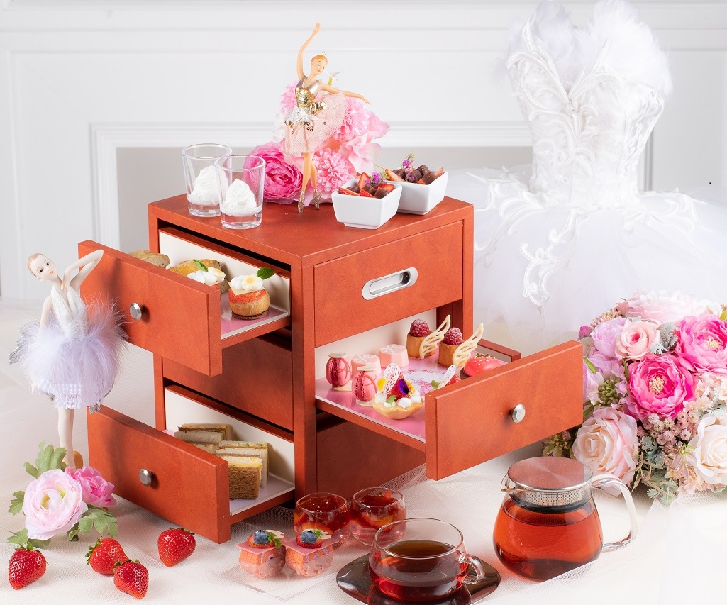 ジュエリーボックスにみたてた箱型アフタヌーンティーセットには、スコーンやサンドウィッチとバレリーナをイメージした10種類のスイーツがイン。