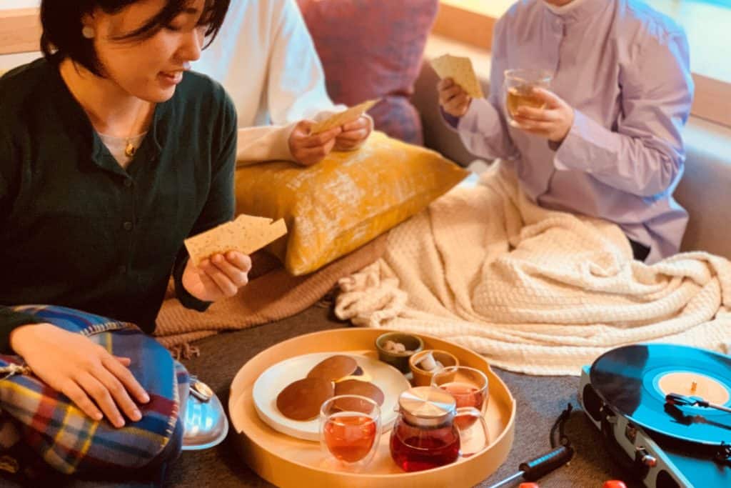 また、フロントでレコードプレーヤーとレコードを借りて、お部屋にBGMをプラスすることも可能。まるでカフェのような居心地のよい客室で、温かい飲み物やスイーツを片手に、家族やパートナーとの時間を楽しめます。さらにボードゲームやカードゲームで遊べば、ぽかぽかを通り越して熱くなっちゃうかも!?