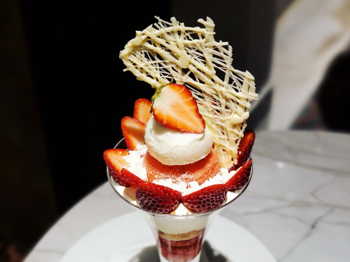 春まで提供予定のいちごのパフェ。(バレンタインデーの時はチョコレートパフェになる可能性あり)