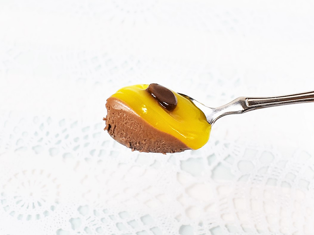 スプーンを深く入れていくとオレンジブラウニーへとたどりつき、さらにその下には濃厚で滑らかなショコラオレンジソースが…。ゼリーからソースまでまとめて口に運ぶと、それぞれの食感が重なりあう独特な口当たりを楽しめますよ。コンビニクオリティを超えてきました…!