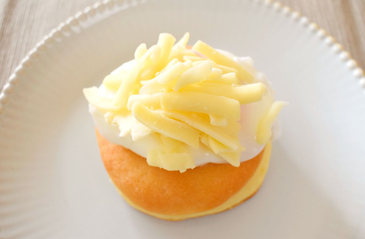 次に、穴の上に温泉たまごをのせ、その上に細切りチーズをたっぷりかけます。