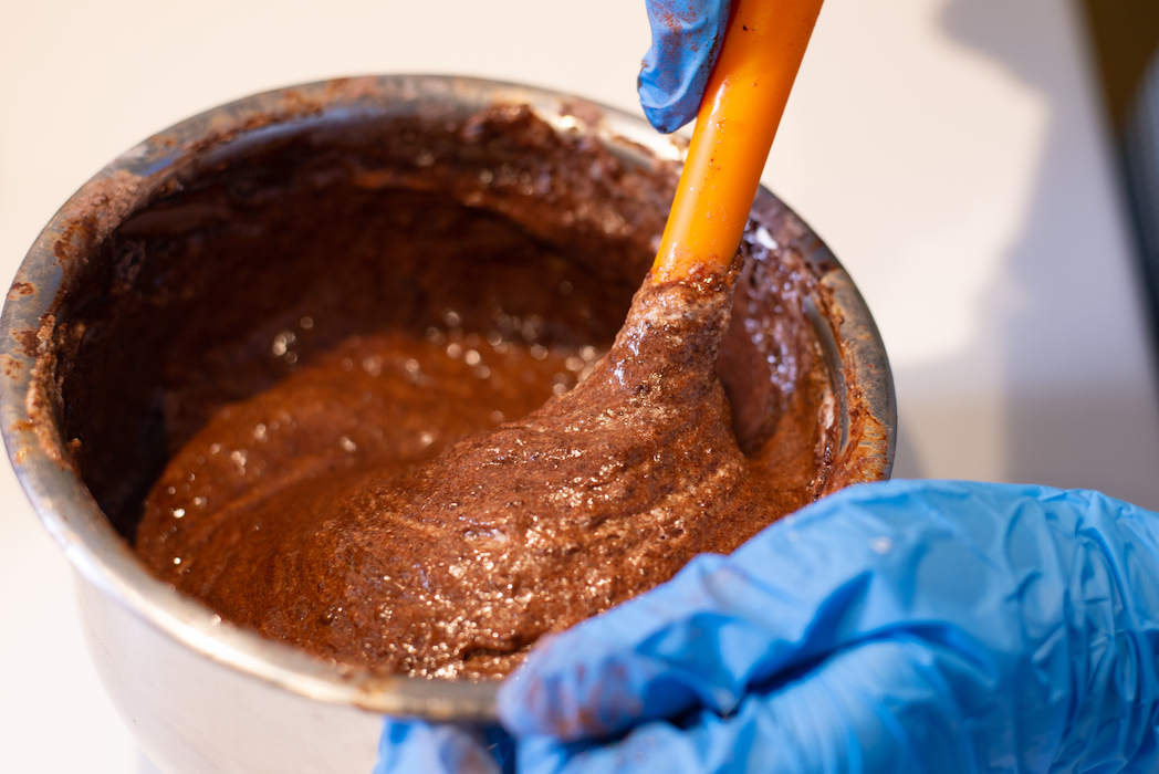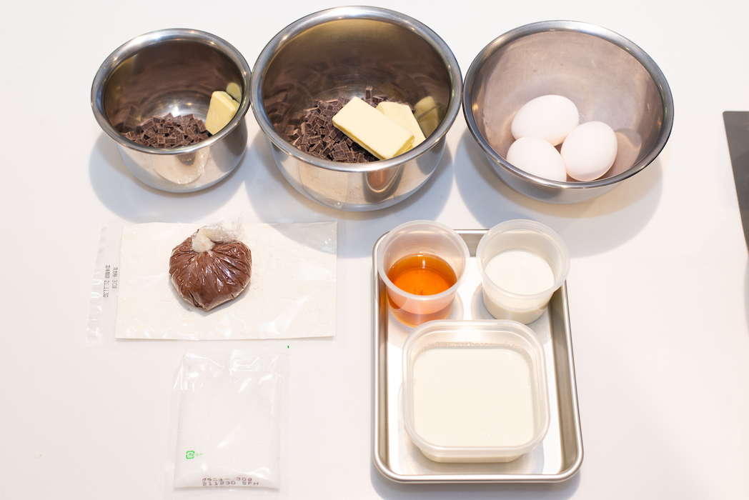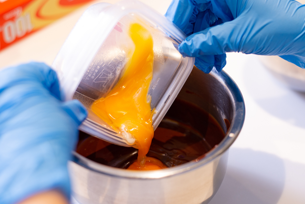 白井先生「今回はビスキュイ生地とガナッシュの両方に、カカオ豆の味わいを最もストレートに感じられる『スイートチョコレート』を使用します。『スイートチョコレート』を使うことで、ほろ苦く、大人っぽい味わいに仕上がりますよ。また、ガナッシュには香りづけとして、ラム酒を入れます」