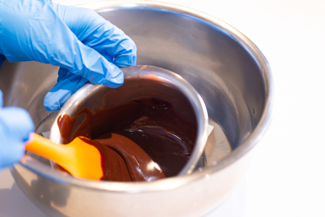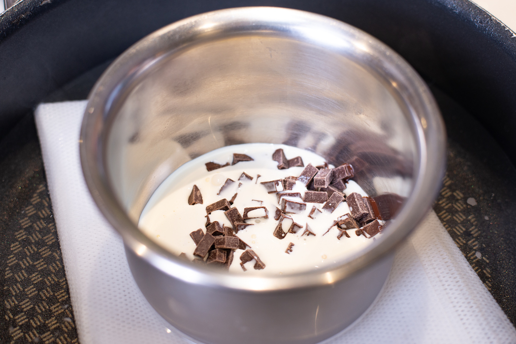 白井先生「ガナッシュを作る時のポイントは、材料を加熱する際のお湯の温度です。温度が高すぎると材料が分離したり、ガナッシュの質感が悪くなったりしてしまいます。お湯の温度は50~60度に保つようにしましょう!また他のチョコレートスイーツを作る時と同じく水分は厳禁です。お水が一滴でも入ってしまうと、ガナッシュの食感が大きく変わってしまいます!」
