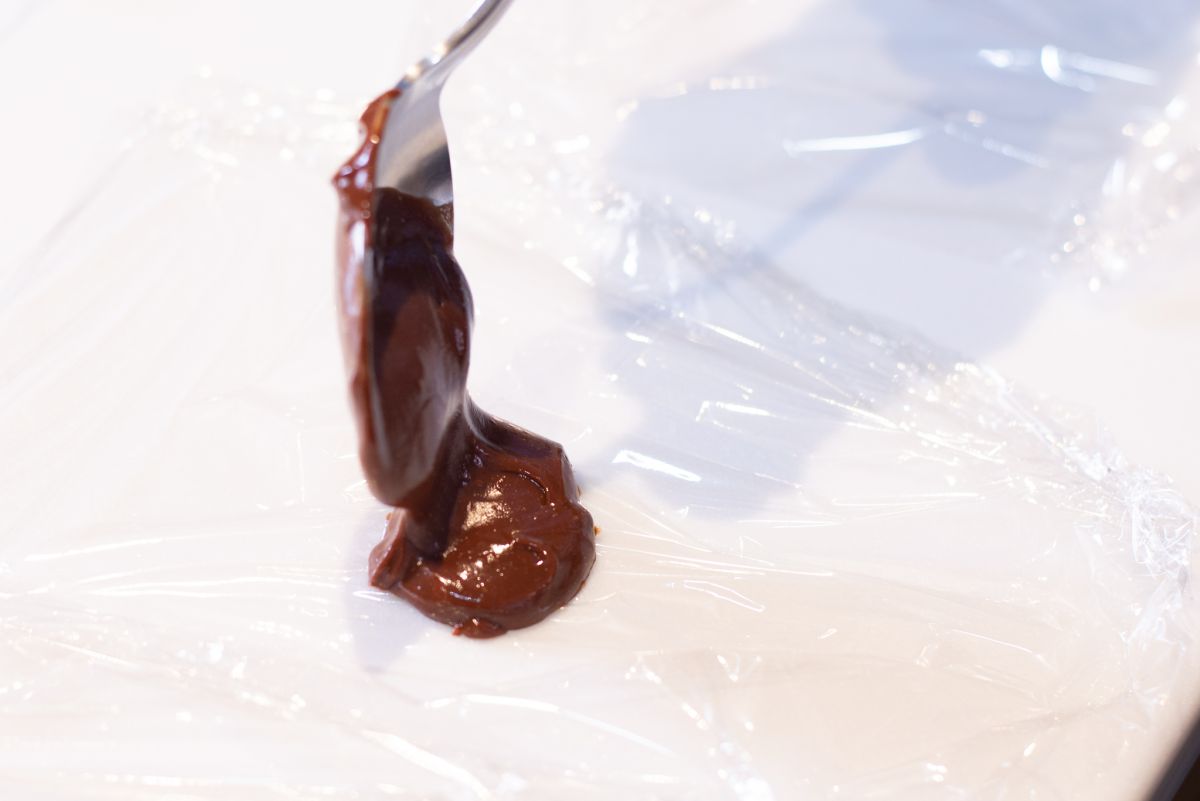 ラップに包んだガナッシュは冷蔵庫へ。およそ15分後には、ほどよい固さのガナッシュに仕上がるのだとか。