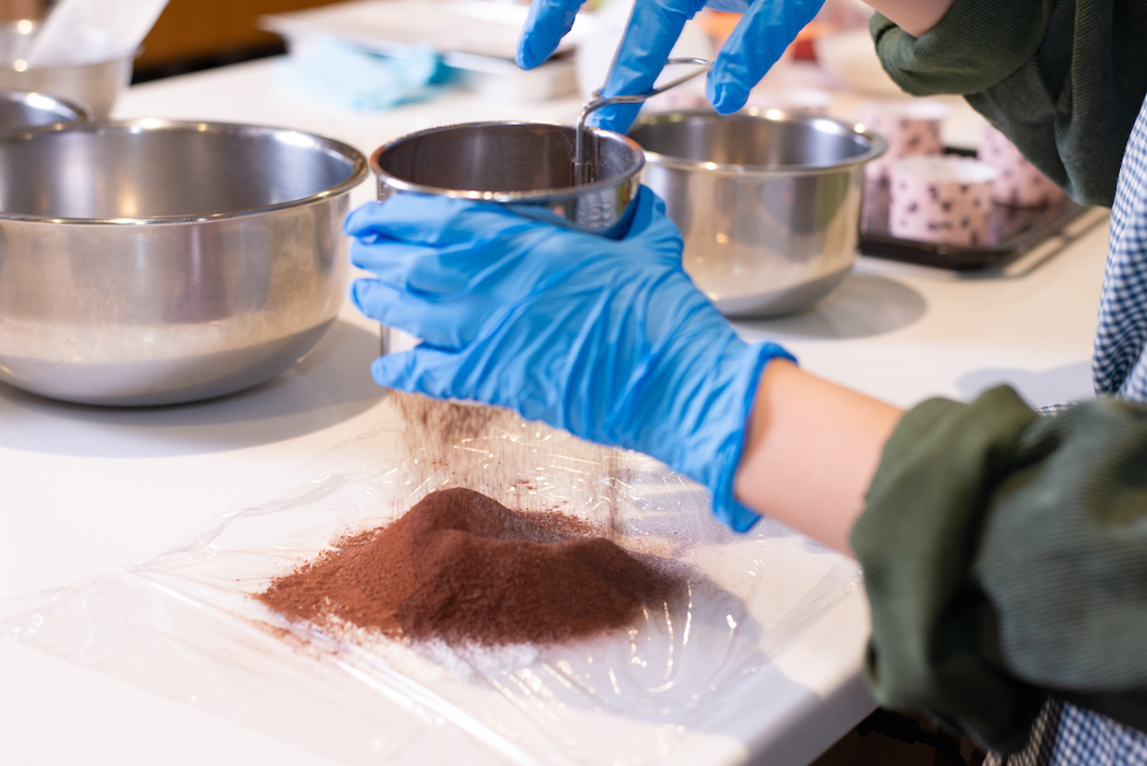 ビスキュイ生地の下準備にも取りかかります。まずは生地のベースとなる、ココアパウダーと薄力粉をふるうところからスタート。