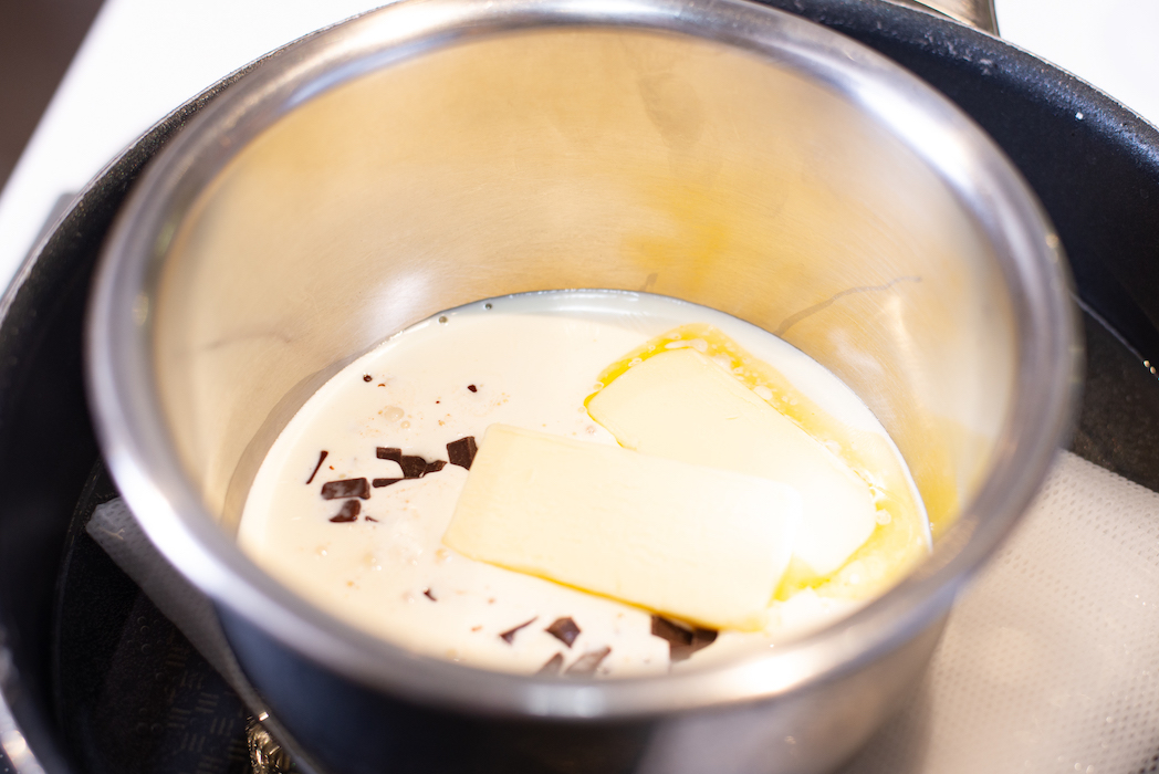 そのかたわらで、チョコレート、生クリーム、バターを湯せんで温めます。この際も、お湯の温度を50~60℃に保つのが大切なのだそう。