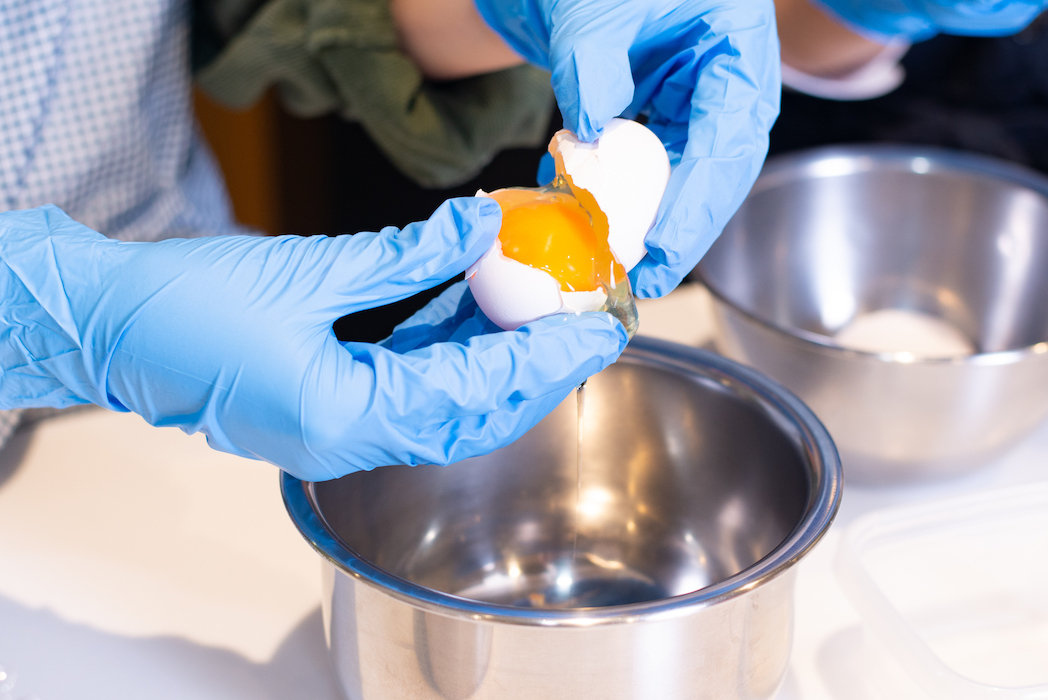 白井先生「卵黄と卵白を分けるときに卵黄が混ざらないよう注意します。卵黄が混ざりこむと泡立ちにくくなりますよ!また油分や水分がついているとメレンゲが泡立ちにくくなるので使う道具はきれいに洗い、水分が残ることのないよう乾かしておきます。」