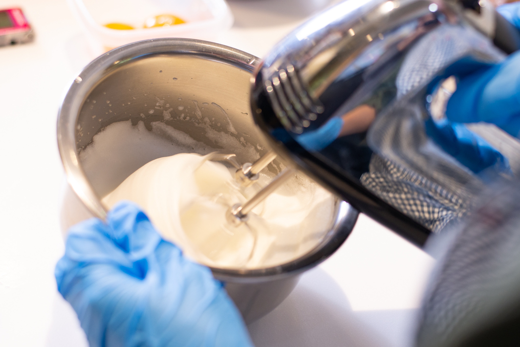 また、ふわふわのビスキュイ生地を作るうえで欠かせないのがメレンゲです。メレンゲとは、卵の卵白と砂糖を合わせ、泡立てたもの。作り方はとてもシンプルですが、白井先生によると、いくつかのポイントを押さえる必要があるようです。