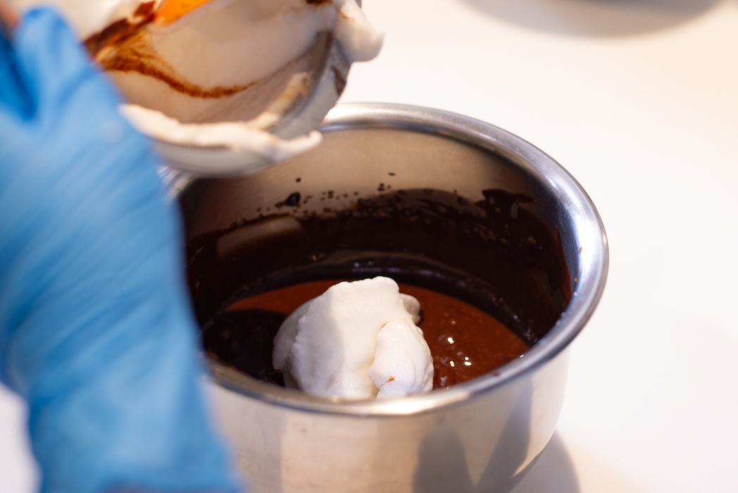 さらにメレンゲと、先ほどふるいにかけたココアパウダーと薄力粉を加え、切り混ぜます。