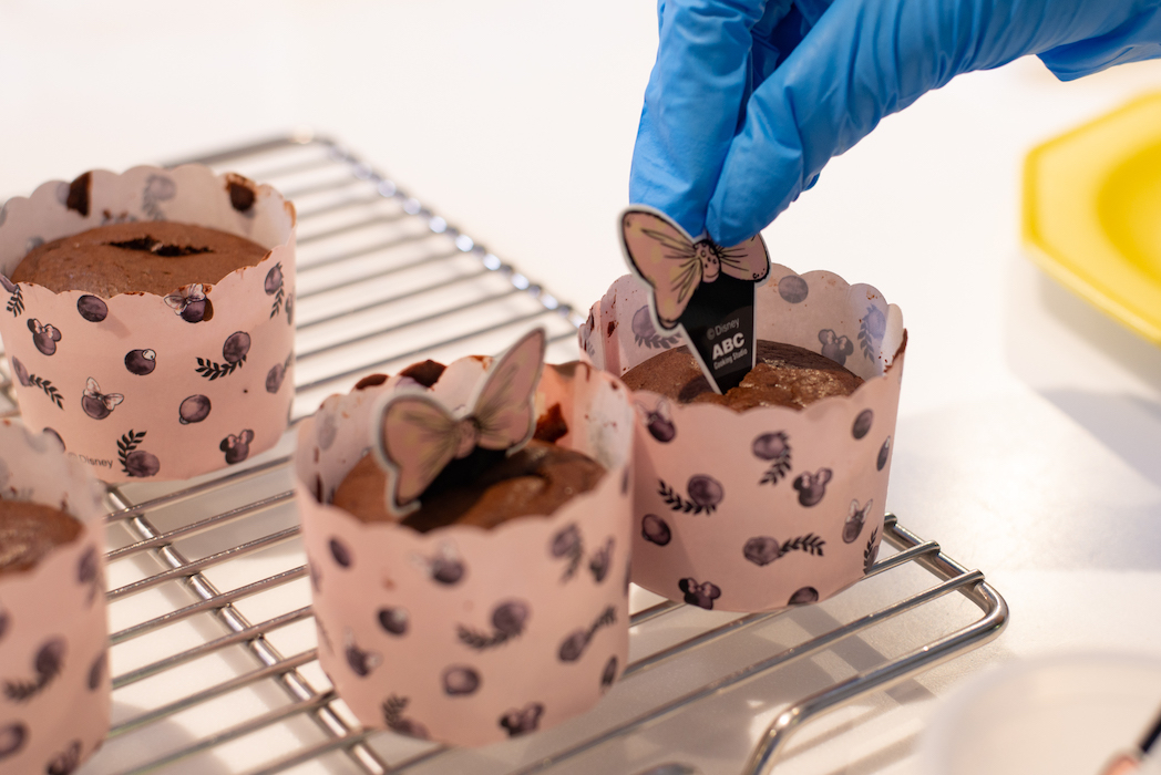 およそ15分後には、焼き上がったフォンダンショコラが目の前に!仕上げとして、ミニーマウスのピックを飾りつけたら完成です。