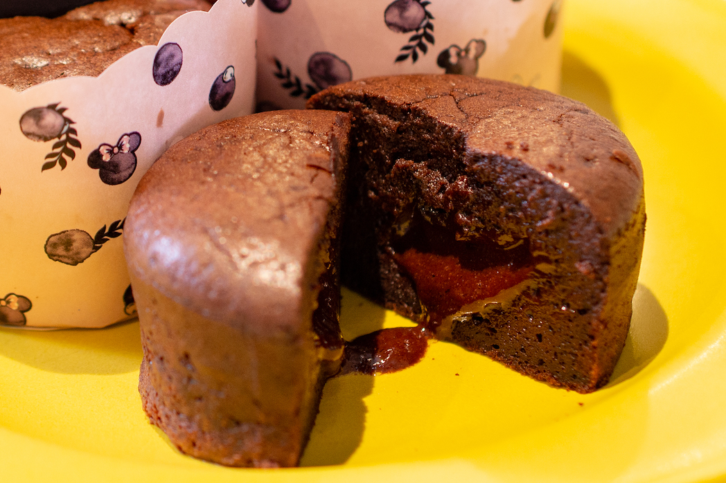 「ミニーマウス/フォンダンショコラ」は、ビスキュイ生地とガナッシュを合わせたお菓子。チョコレートや薄力粉、卵白、ココアパウダーなどがビスキュイ生地の材料に、チョコレートや生クリーム、バター、ラム酒がガナッシュの材料になります。