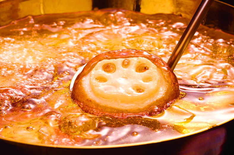 美味しさのヒミツは、鹿児島産の地酒や焼酎などを使った味付け。さつまあげは味の違いによって色々な形で成型され、菜種油で2回、風味よく揚げられます。しっかりと余分な油を切ると外はこんがり、中はふっくらなさつまあげのできあがり。